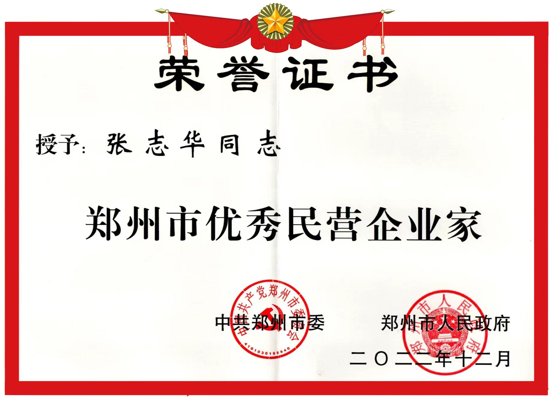 董事长张志华被中共郑州市委、郑州市人民政府授予“郑州市优秀民营企业家”荣誉称呼